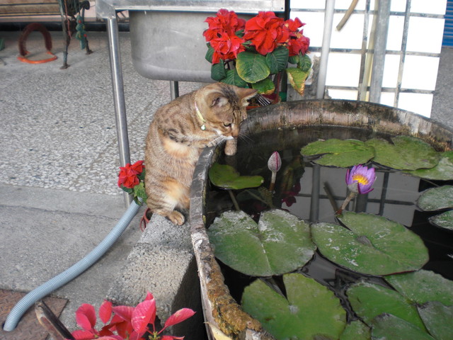 9/19我們御貓坊門口有個檜木桶養了許多小魚