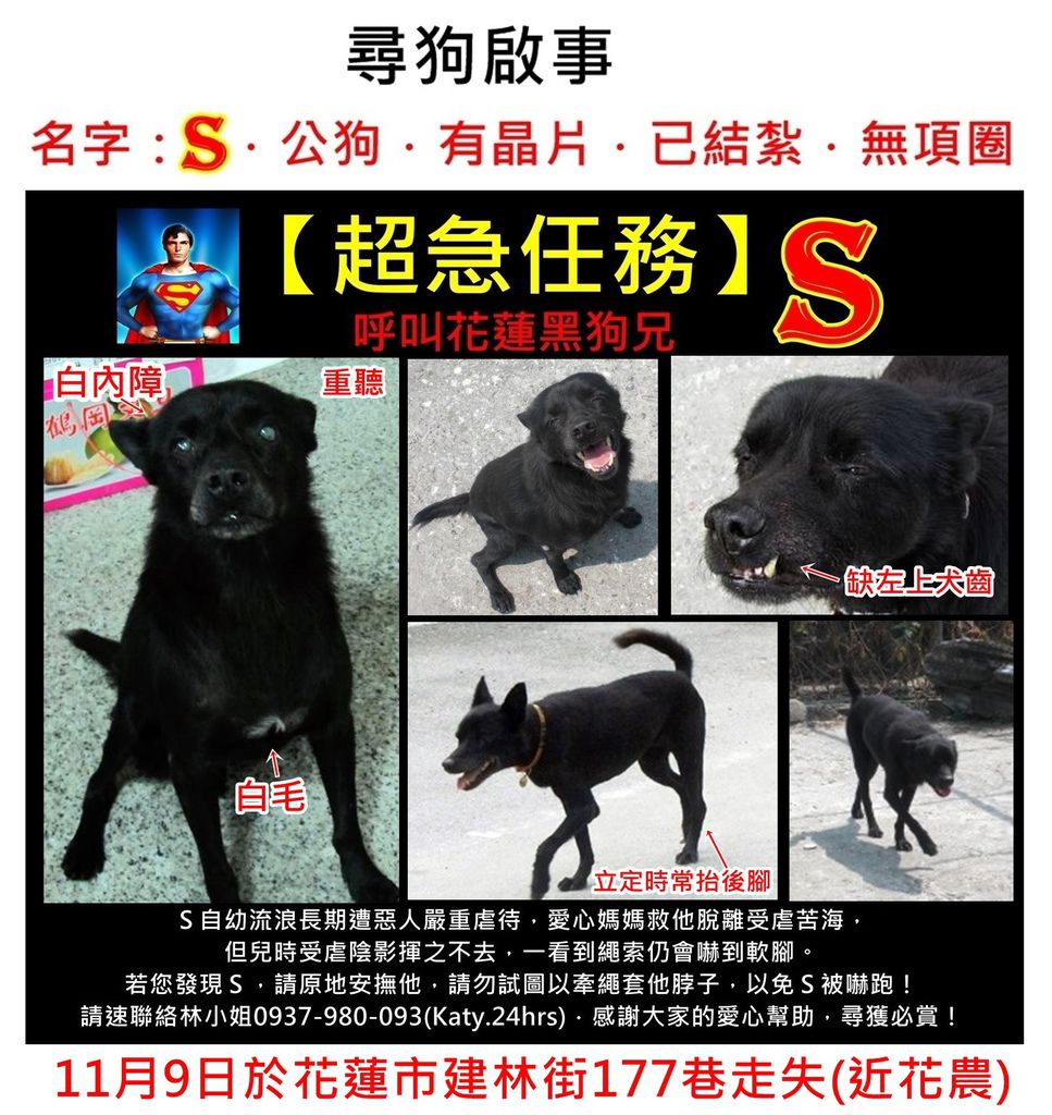在那附近的朋友們也請多多留意,如果有看到S,請原地安撫他,並速速來電,感謝大家!!!