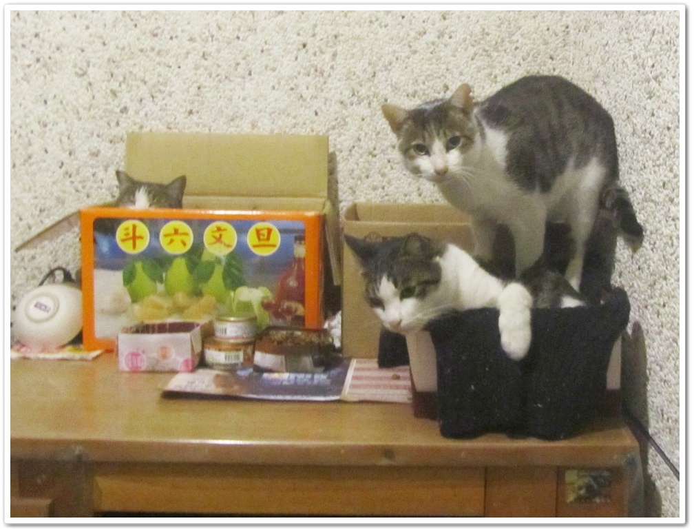 每個紙箱裡都有放溫暖的布料和暖暖包墊底,但是這兩位最喜歡的還是最小最擠的喜餅禮盒